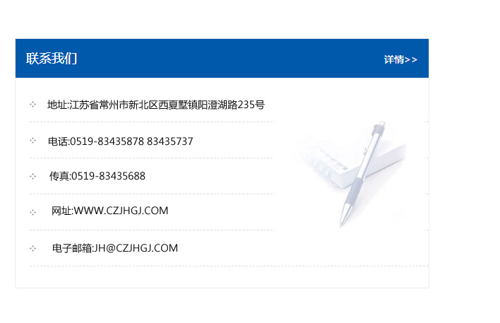 地址:常州市新北區友邦商務大廈1幢16、17層  電話:0519-85101652  傳真:0519-85112595  郵編:213022  網址:www_cz-jiayue_cn.zg-bg.com  郵箱:xiajifengaa@163.com